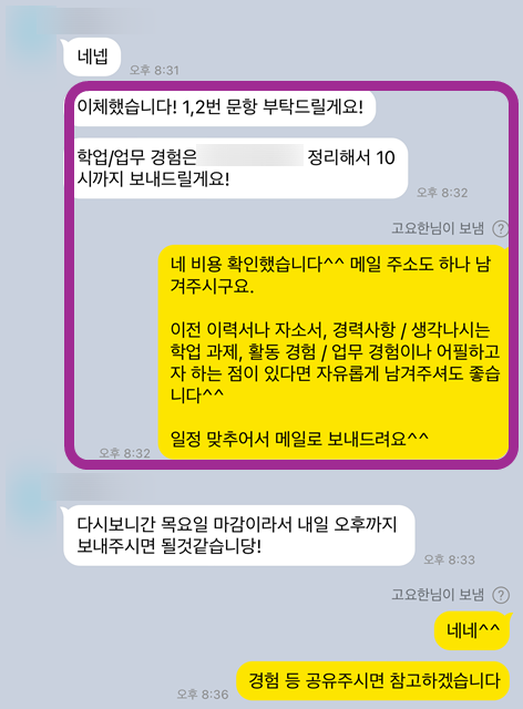 언제나 빠르고 친절하게 소통해주셔서 너무 좋았어요. 제가 생각하지 못했던 관점과 형식으로 제 역량을 잘 풀어내주셔서 앞으로 자소서 쓸때 두고두고 참고할 수 있을 것 같습니다. 감사합니다:)