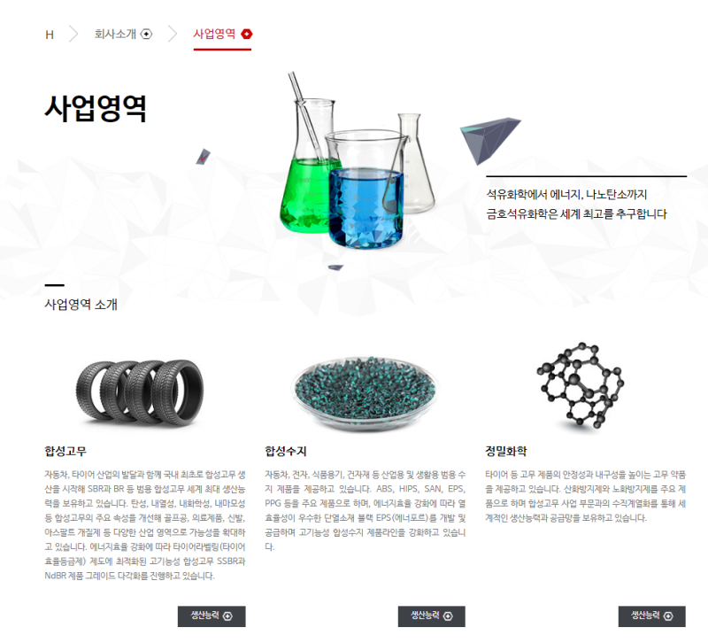 - 주요 사업: 합성고무, 합성수지, 정밀화학