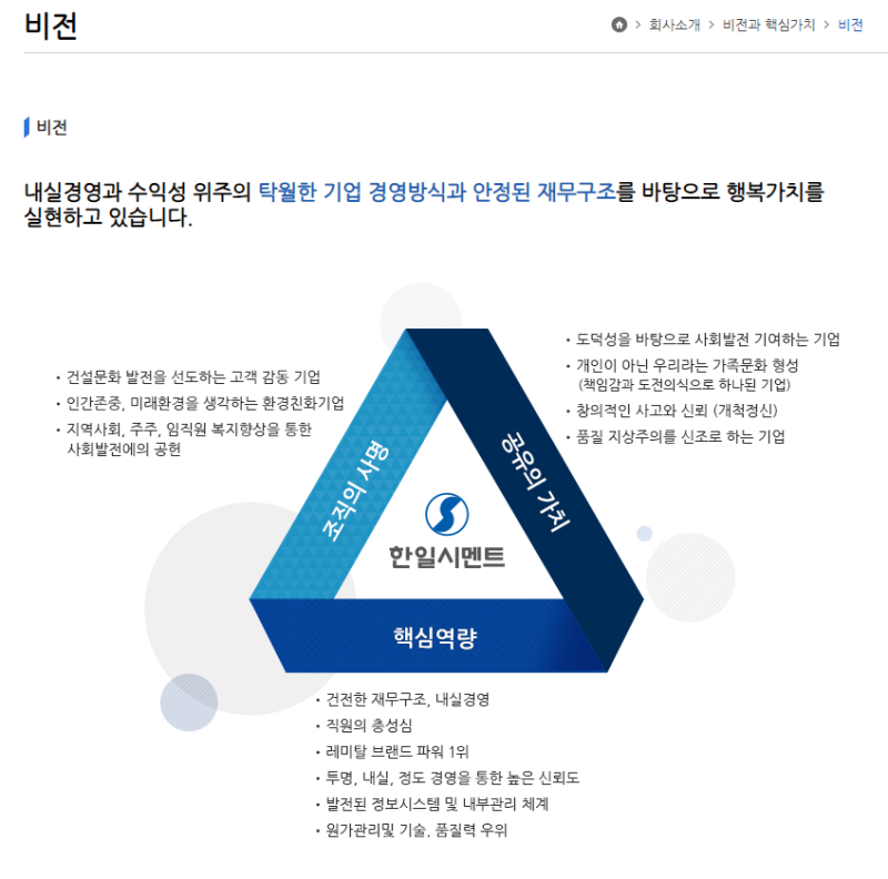 한일시멘트 분석자료 (핵심가치, 비전, 인재상)