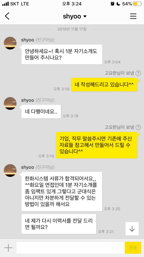 이번에 두 번째로 작업물 요청 드렸는데 항상 빠르게 작업 해주시고 이외 질문사항도 친절히 답변해주셔서 좋았습니다. 제가 그동안 왜 서류 합격률이 낮았는지 알겠더라구요.