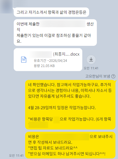 안녕하세요! 10년 이상 자소서 첨삭 전문가입니다. 안녕하세요! 10년 이상 자소서 컨설팅 경력을 가진, 누적 3,000건 이상의 자소서 첨삭 경험을 가진 ...