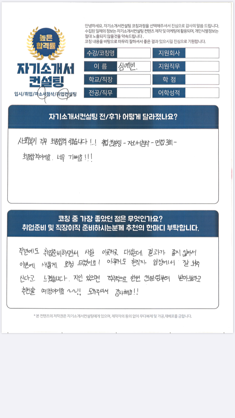 안녕하세요! 10년 차 자기소개서 컨설턴트입니다. 여러분, 안녕하세요! 10년 이상 자기소개서 컨설팅만 해온 베테랑입니다. 누적 3,000건 이상의 자소서 첨삭 경험과 수많은 ...