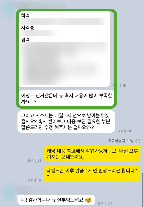 안녕하세요! 10년 이상 자소서 컨설팅 전문가입니다. 안녕하세요! 10년 이상 자소서 컨설팅 경력을 가진 전문가입니다. 누적 3,000건 이상의 자소서 첨삭 경험과 ...