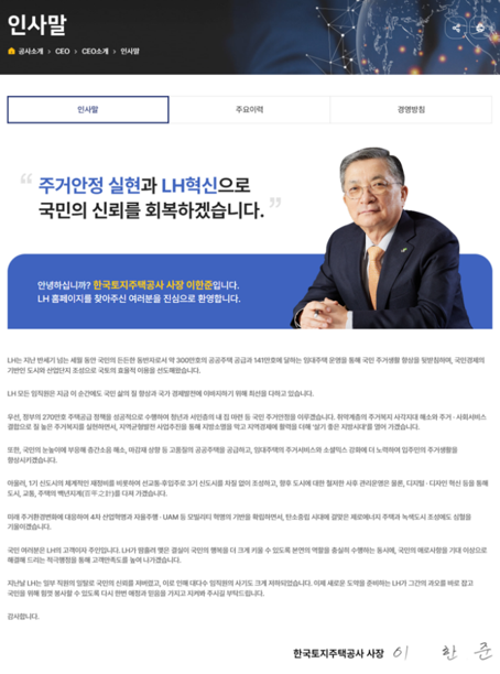 LH 핵심 가치: 국민 주거 안정, 국토의 효율적 이용, 지속 가능한 발전